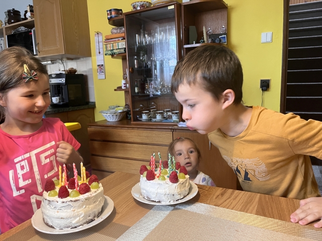Po návratu z tábora nás čekají také narozeninové oslavy, které si rozdělujeme na třikrát. Slavení není nikdy dost. Joz v červnu prohlašoval, že si nic nepřeje, že všechno má. Na začátku července se však seznam začínal plnit. Do hračkářství už asi chodit nebudeme: černá mikina s kapucí- klokanovou kapsou a hlavně bez nápisu, vodní kamera, sedací pytel, fotbalový dres. Ká by si přála nástěnku, fotoknihu a dobrodružnou literaturu.